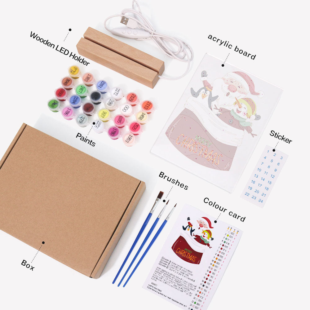 This festive paint by numbers kit in a 6"x8" format with LED wooden display base contains everything you need to create your holiday masterpiece: