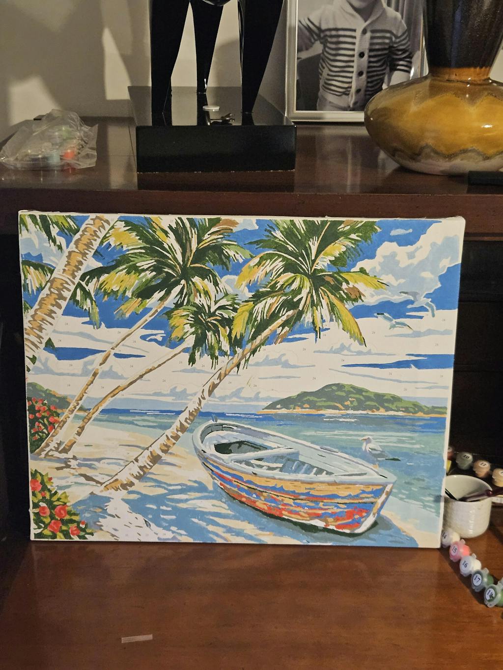 2) You will receive a ready-to-use kit containing the canvas with the numbered areas, the numbered pots of paints, paint brushes and a picture of the expected result to guide you. Let the journey begin!