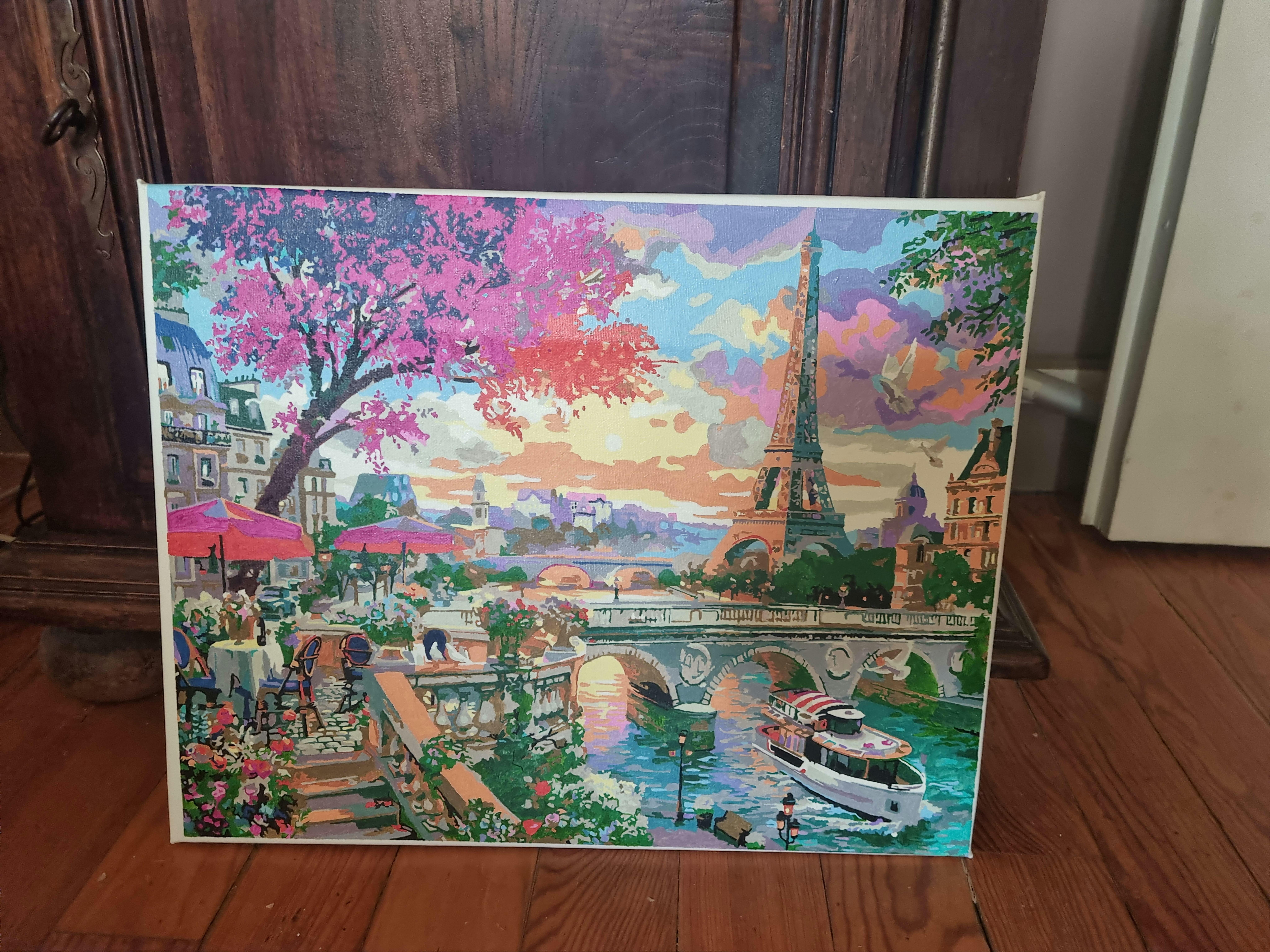 Very beautiful painting with all the necessary elements, I really appreciated it! Very pretty. Very relaxing. The amount of paint put in the small pots is enough to paint the entire canvas so don't hesitate to put a lot of acrylic on the light areas because the numbers are difficult to hide otherwise. I bought the 'canvas stretched on frame' model as I always do, and as always I am satisfied. Note that there is excellent contact with the company, particularly with Claire. In case of any problems, you are dealing with a person, not a chatbot. Figure d'art is very easily reachable on Messenger. For painting, I bought brushes from an art store. I took 0 and 3/0 from the Jaxhair brand, which can be found online at 'géant des beaux arts' or directly in stores. Without the 0 and 3/0 brushes, it is difficult to get as close as possible to the drawing proposed by the photo. I am very satisfied and this is the 4th time I have ordered a canvas on frame from figure d'art, so I highly recommend it.