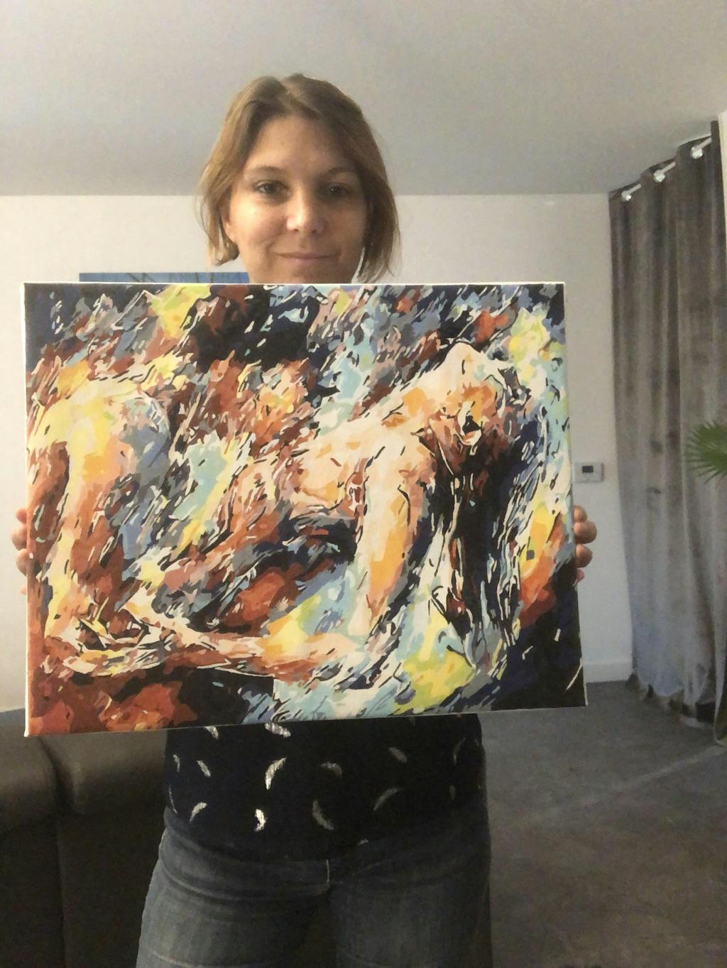 2) You will receive a ready-to-use kit containing the canvas with the numbered areas, the numbered pots of paints, paint brushes and a picture of the expected result to guide you. Let the journey begin!