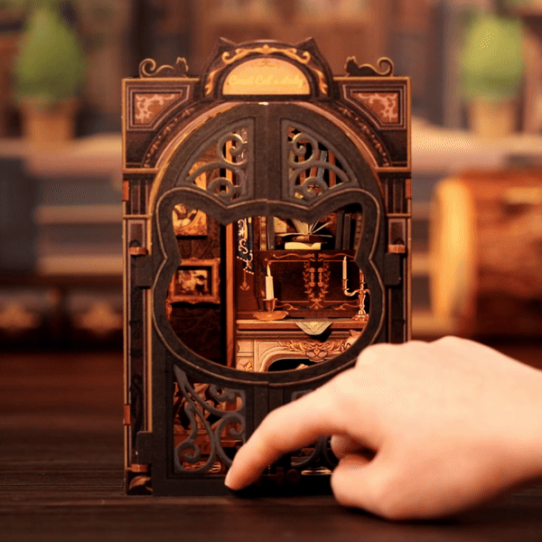 Bring the charm and elegance of Count Cat's Study to your bookshelf, desk, or any flat surface with this delightful DIY Book Nook kit. Assemble, decorate, and light up your miniature world! Display it as a unique bookshelf insert or a standalone elegant scene.