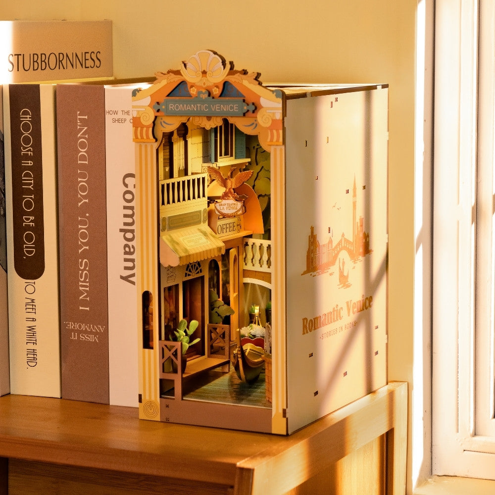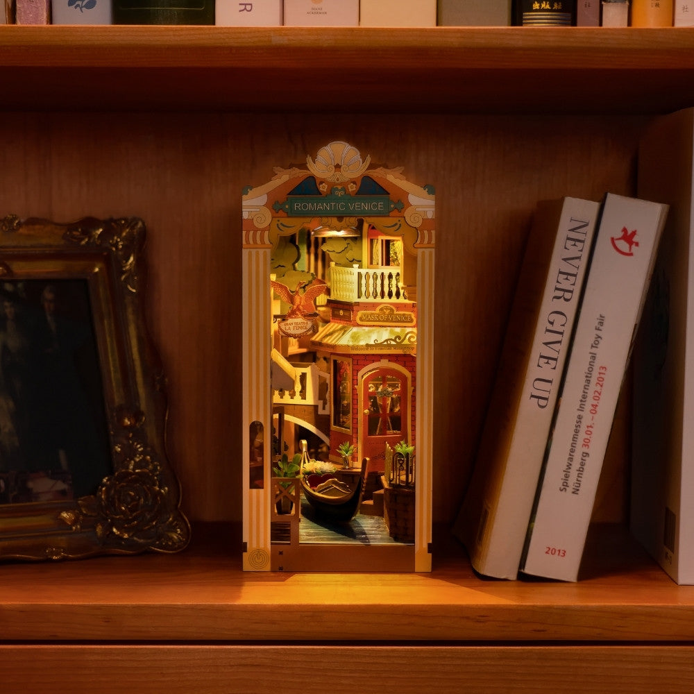 Transport yourself between your books to a corner of Italy with Rolife's Venice Romantic. This Book Nook offers a breathtaking view of the Venice canal, complete with a romantic boat ride and iconic Italian landmarks.