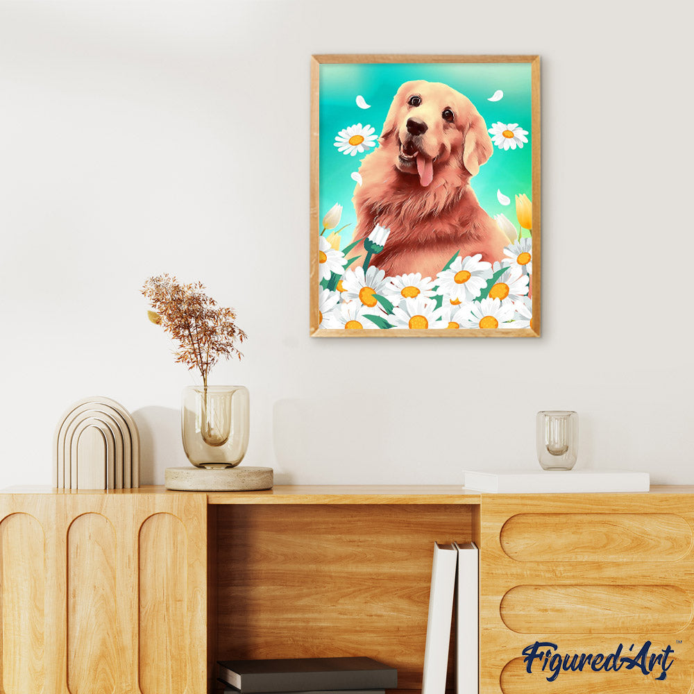 Model: Golden retriever and daisies