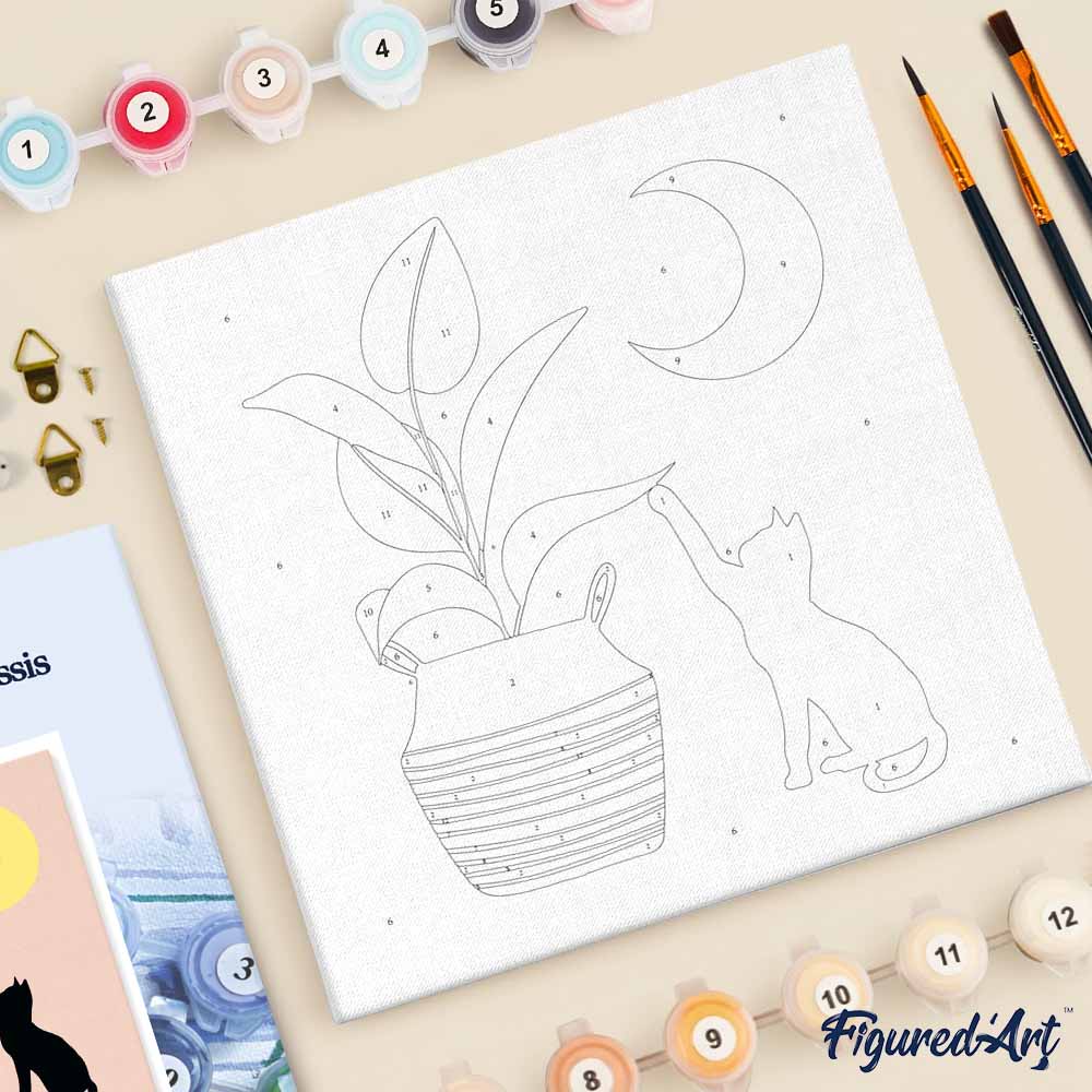 Model: Mini Paint by numbers Cat plays with plant in the moonlight 20x20cm already framed