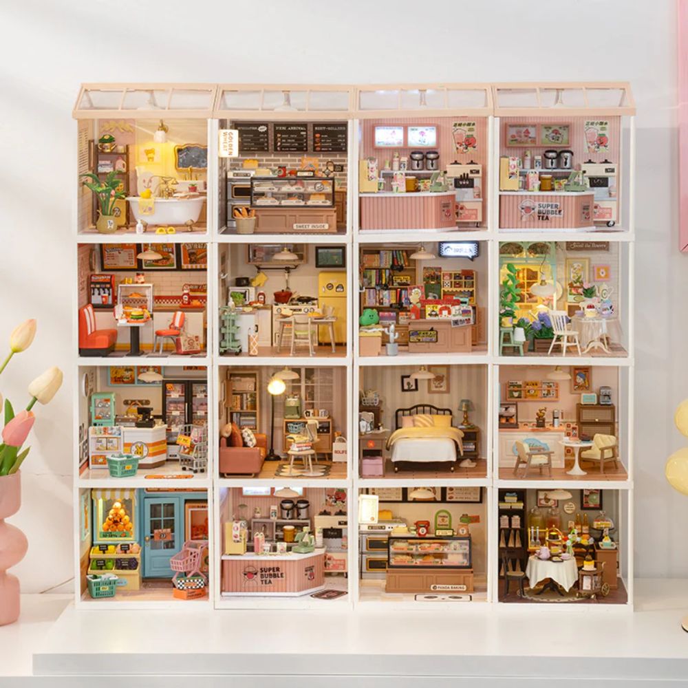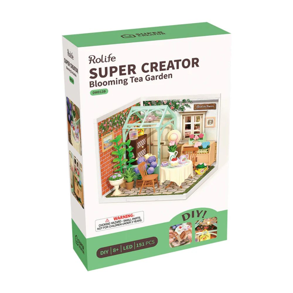 Immerse yourself in the serene ambiance of a blooming tea garden with this miniature house kit. This model allows you to recreate a space where you can enjoy a cup of tea while admiring the beauty of flowers. The interior is furnished with elements such as a tea table, chairs, floral arrangements, green plants, and LED lighting, creating a relaxing atmosphere.